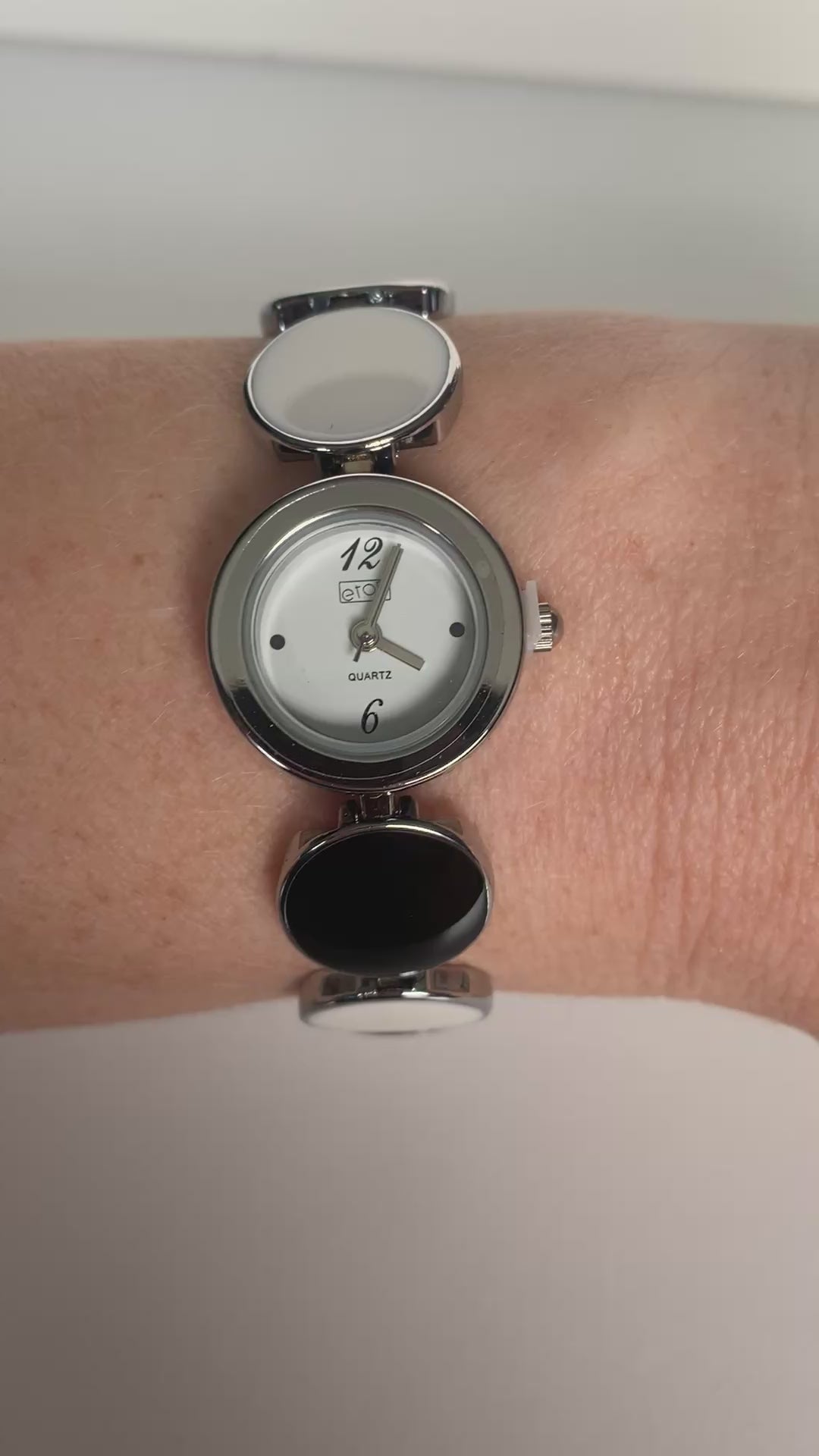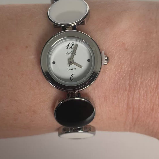 This is a striking women's bracelet watch with a modern, high-contrast design. The unique band is made up of alternating circular links in glossy black and white, connected by sleek silver-tone settings. It features a small, simple silver-tone watch face with a white dial. This piece functions beautifully as both a precise timekeeper and a fashionable, monochromatic jewelry accessory, securing easily with a jewelry clasp.