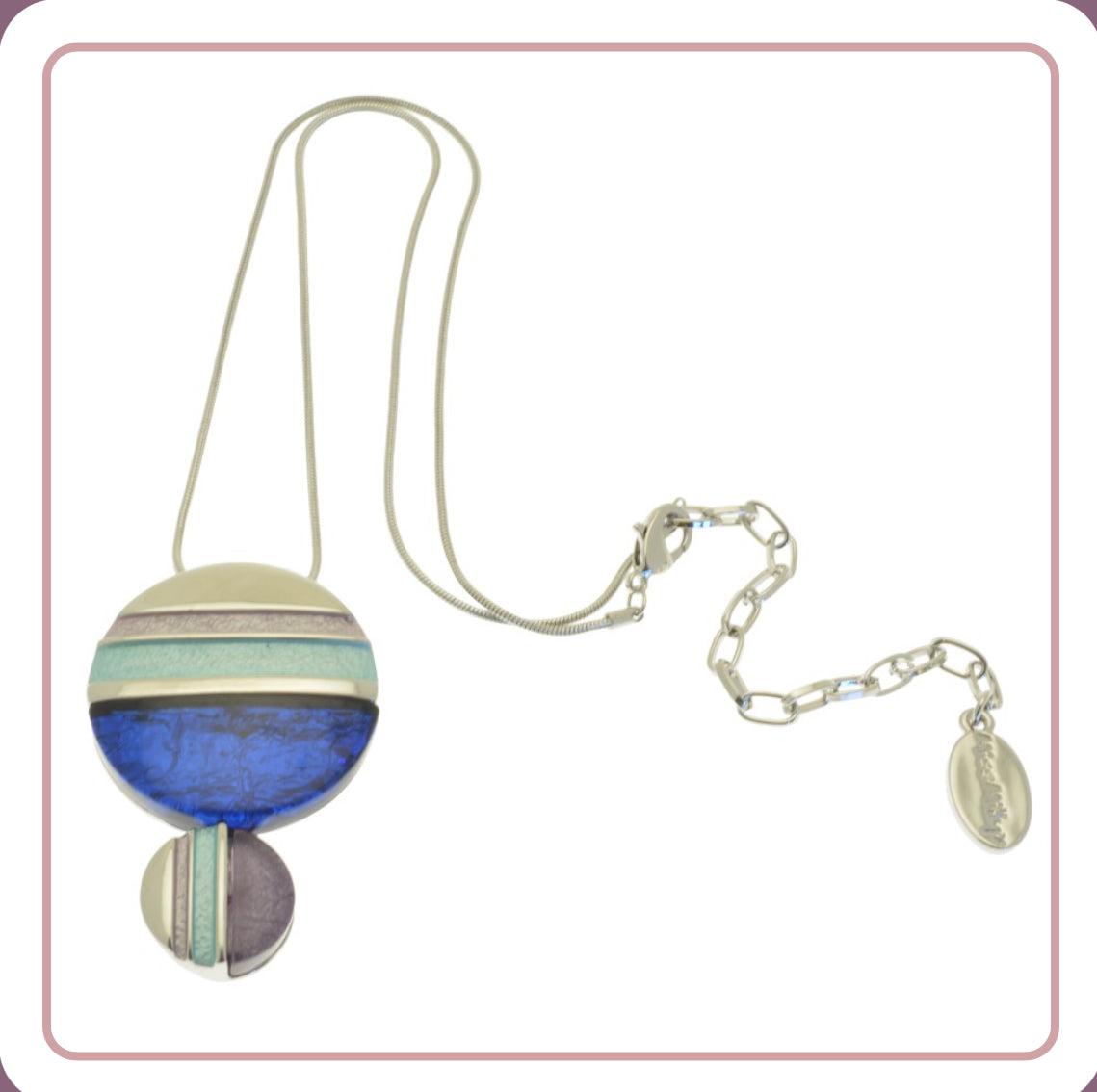 An attractive combination of bold, resin semi-circles in blue and lilac with pastel handpainted stripes in lilac and aqua creates an interesting necklace. The pendant measures 4.5cm high by 3cm wide and it hangs from a 41cm snake chain with an 8cm extender.