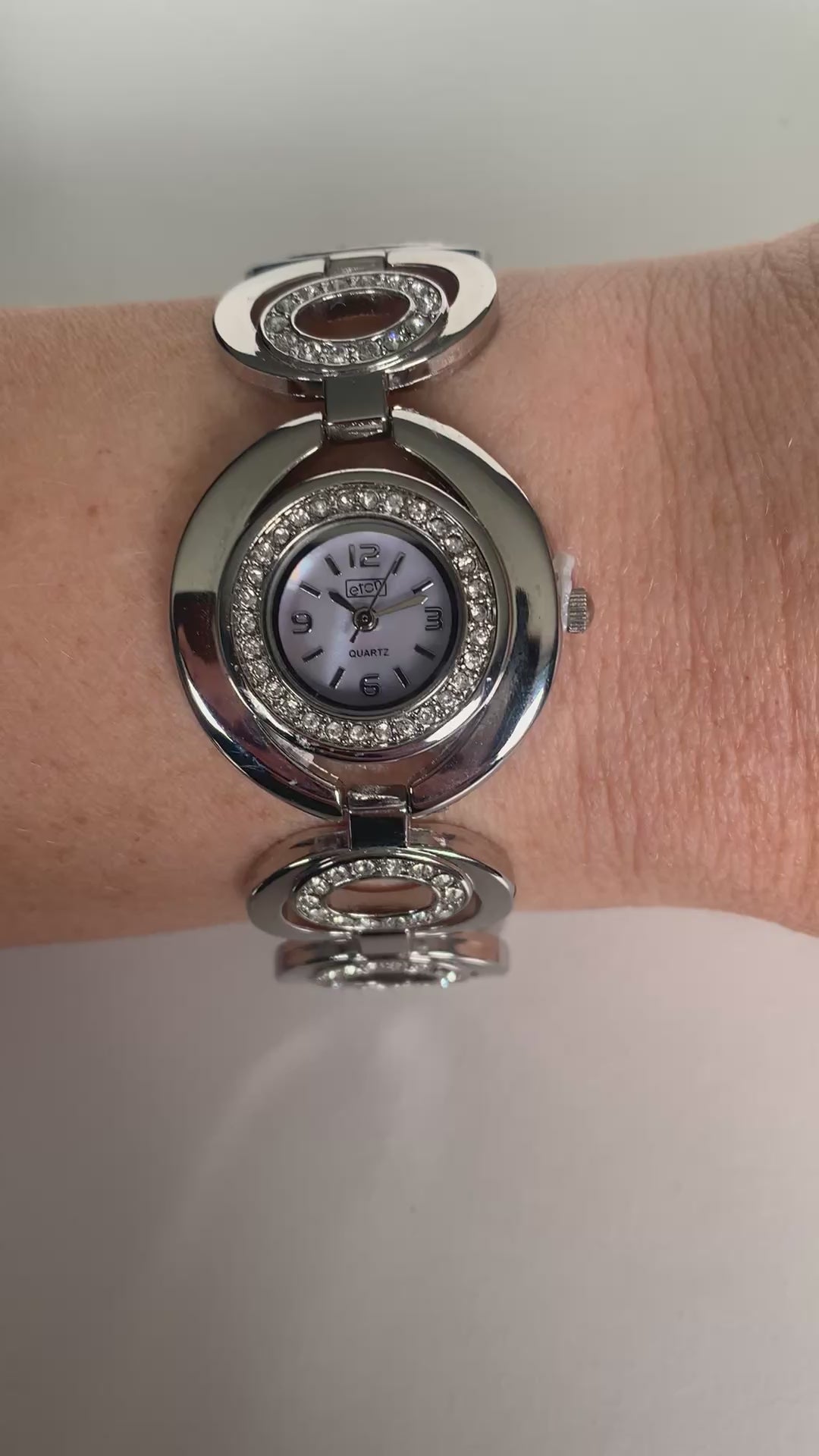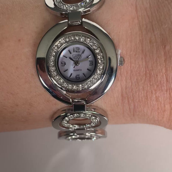 This stunning women's bracelet watch is crafted in polished silver-tone metal and designed for maximum sparkle. The circular case features a bezel completely lined with clear rhinestones, framing a luminous mother-of-pearl-like dial. The sleek band continues the dazzling aesthetic, featuring oval links with rhinestone accents in the center of each one, making it a glamorous jewelry piece perfect for special occasions.