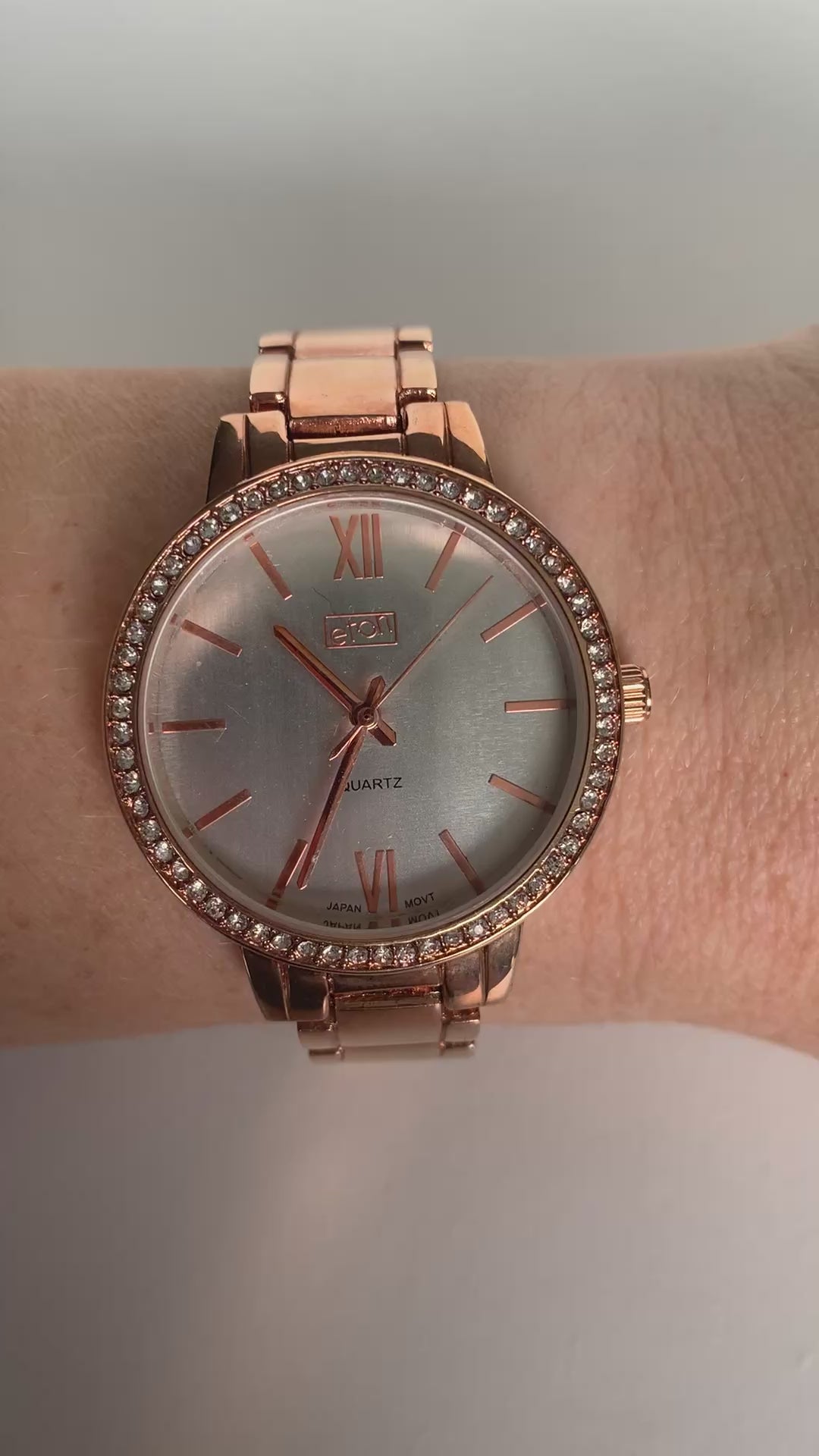 Get ready to shine! This beautiful women's watch features a warm rose gold-tone bracelet and case, framing a clean silver-brushed dial. The real eye-catcher is the bezel, completely surrounded by glittering crystals for maximum impact. A perfect blend of classic style (with Roman numeral markings) and modern dazzle.